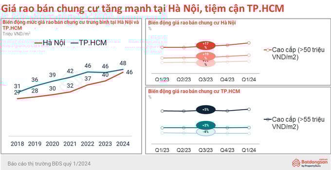 Theo báo cáo thị trường bất động sản quý I/2024 của Công ty PropertyGuru Việt Nam, sau 6 năm, tốc độ tăng giá trung bình của chung cư ở Hà Nội lên đến 70%. Cụ thể, chung cư ở Hà Nội có giá trung bình 46 triệu đồng/m2, giá chung cư TP.HCM là 48 triệu đồng/m2. Trong khi thời điểm đầu năm 2018, giá rao bán chung cư Hà Nội và TP.HCM mới chỉ là 27 và 31 triệu đồng/m2.