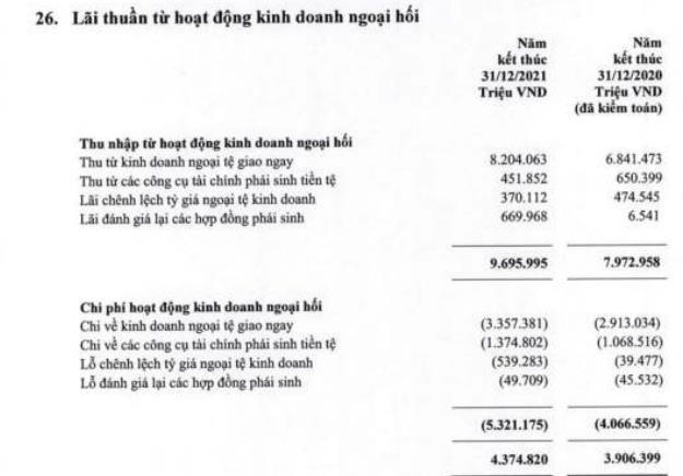 Xét về tốc độ tăng trưởng, lãi từ kinh doanh ngoại hối tại Techcombank tăng nhanh nhất, đạt hơn 231 tỷ đồng, trong khi năm trước chỉ lãi 745 triệu đồng nhờ giảm lỗ từ kinh doanh ngoại tệ giao ngay.