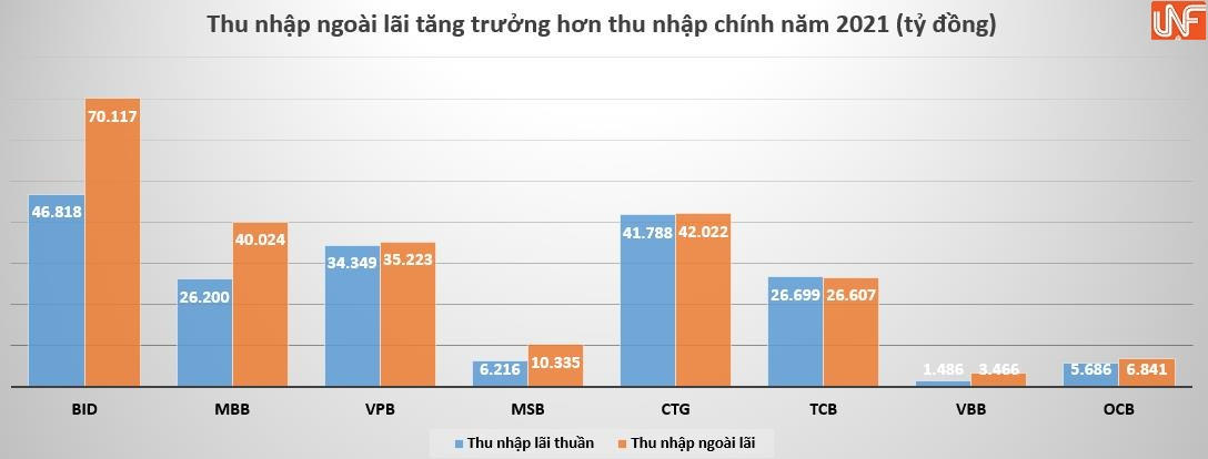 Cụ thể, năm 2021 nguồn thu nhập lãi thuần tại BIDV đạt 46.818 tỷ đồng trong khi đó nguồn thu ngoài lãi đạt 70.117 tỷ đồng. Tại Techcombank cả hai nguồn thu đều xấp xỉ bằng nhau hơn 26.000 tỷ đồng; VPBank ghi nhận thu nhập chính đạt 34.349 tỷ đồng và thu ngoài lãi hơn 35.000 tỷ đồng; thu nhập lãi thuần tại MBBank đạt 26.200 tỷ đồng trong khi nguồn thu ngoài lãi đạt hơn 40.000 tỷ đồng;...