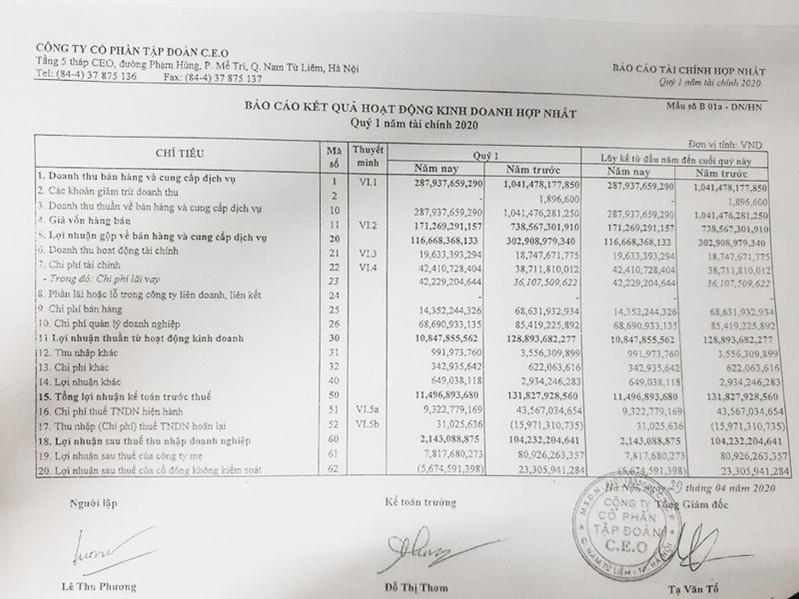 Báo cáo kết quả hoạt động kinh doanh hợp nhất quý I/2020 của Công ty cổ phần Tập đoàn C.E.O (HNX: CEO).