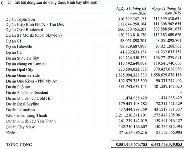 Hết quý I Đất Xanh có 8.552 tỷ đồng hàng tồn kho chủ yếu là các dự án bất động sản dở dang. Trong đó dự án Khu dân cư Long Thành có tồn kho lớn nhất với 3.211 tỷ đồng.