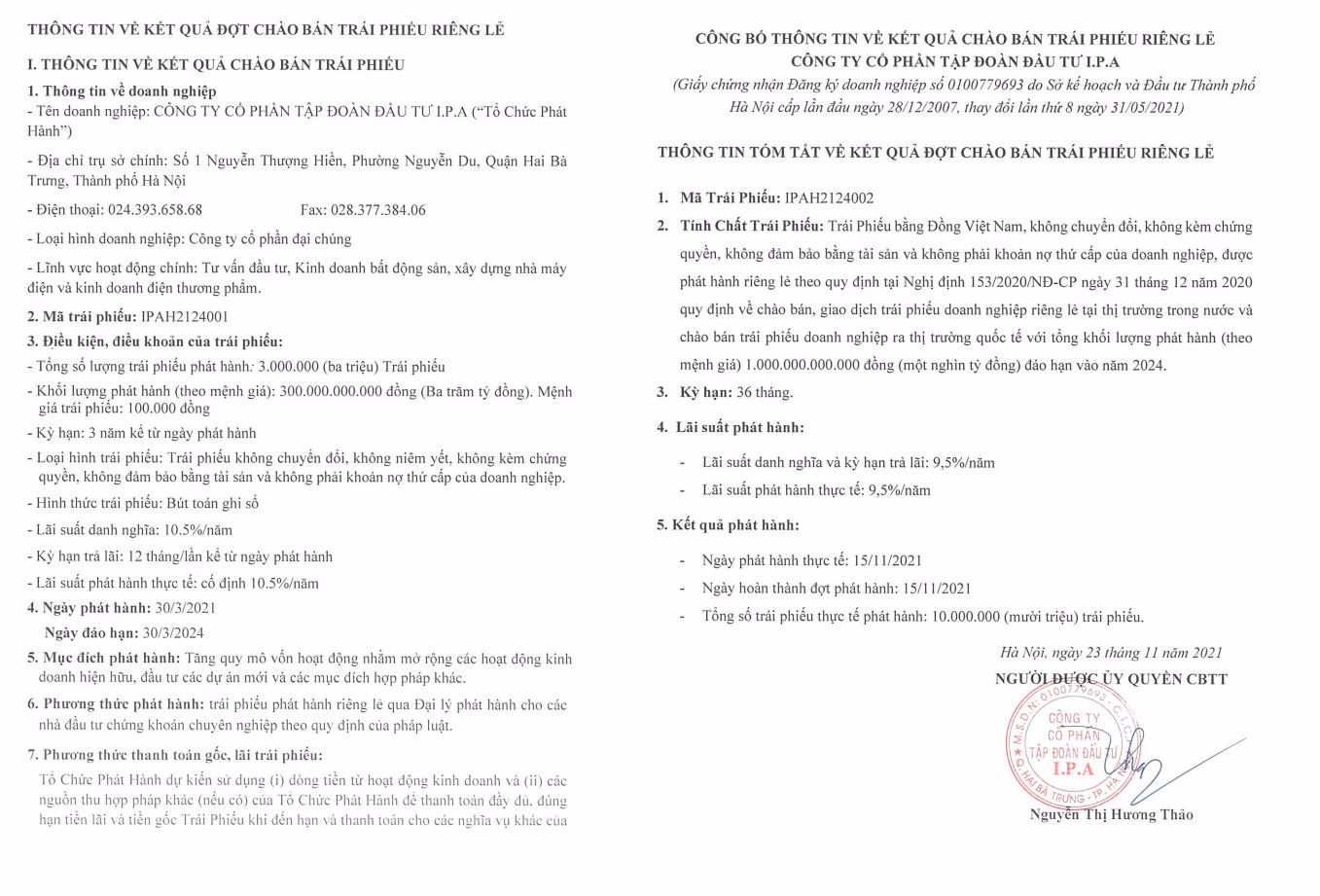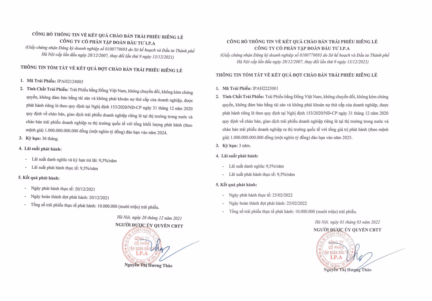 4 kỳ trái phiếu liên tiếp là: IPAH2124001 phát hành ngày 30/3/2021 trị giá 300 tỷ đồng, IPAH2124002 phát hành ngày 15/11/2021 trị giá 1.000 tỷ đồng, IPAH2124003 phát hành ngày 20/12/2021 trị giá 1.000 tỷ đồng và IPAH2225001 phát hành ngày 25/12/2022 trị giá 1.000 tỷ đồng.