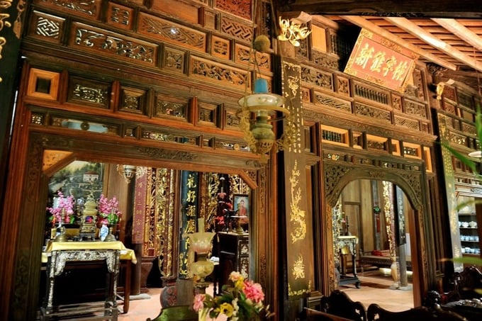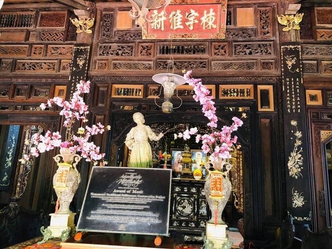 Các liễn đối bên trong và tranh treo tường tại đây đều được cẩn xà cừ hết sức lộng lẫy. Nối liền các trục chính của ngôi nhà cổ là hệ thống bao được chạm trổ tỉ mỉ từ những tấm gỗ vuông. Họa tiết của chúng không chỉ mô phỏng lại các hình thức sinh hoạt dân gian mà còn thể hiện tín ngưỡng văn hóa của người Nam Bộ.
