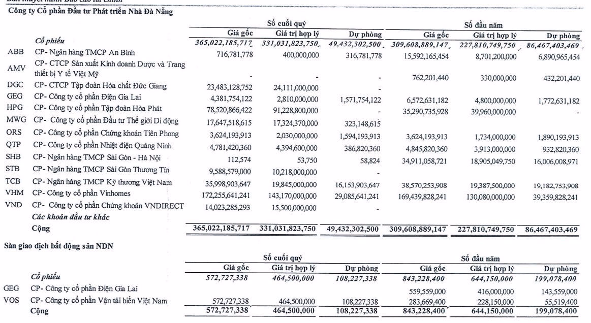 Nếu so với hồi đầu năm, đầu tư chứng khoán kinh doanh của Nhà Đà Nẵng đã tăng thêm 18%, từ 309,6 tỷ đồng lên 365 tỷ đồng do ghi nhận dự phòng giảm giá chứng khoán đầu tư giảm 57%, từ 86,5 tỷ đồng còn 49,5 tỷ đồng.