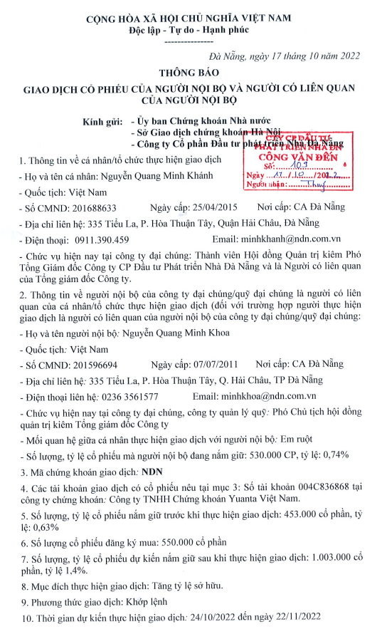 Các giao dịch của lãnh đạo CTCP Đầu tư Phát triển Nhà Đà Nẵng (NDN) trong thời gian gần đây đang thu hút nhiều sự chú ý của giới đầu tư. Cụ thể, ông Nguyễn Quang Minh Khánh, thành viên HĐQT kiêm Phó Tổng giám đốc của NDN đã đăng ký mua 550.000 cổ phiếu NDN để nâng tỷ lệ sở hữu vốn từ 0.63% lên 1.4%. Thời gian dự kiến thực hiện giao dịch từ ngày 24/10 – 11/11/2022.