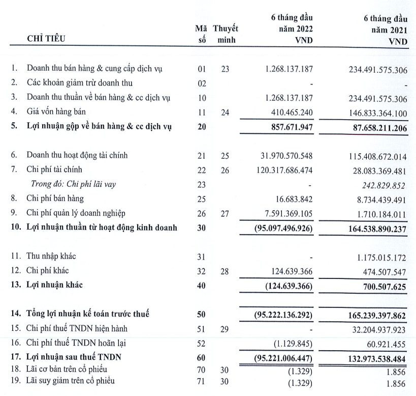Trong 6 tháng đầu năm, doanh thu giảm 99,5% so với cùng kỳ, tương ứng giảm 233,22 tỷ đồng về 1,27 tỷ đồng (không đáng kể); doanh thu tài chính giảm 72,3% so với cùng kỳ, tương ứng giảm 83,44 tỷ đồng về 31,97 tỷ đồng; chi phí tài chính tăng 328,5%, tương ứng tăng thêm 92,24 tỷ đồng lên 120,32 tỷ đồng và các hoạt động khác biến động không đáng kể.