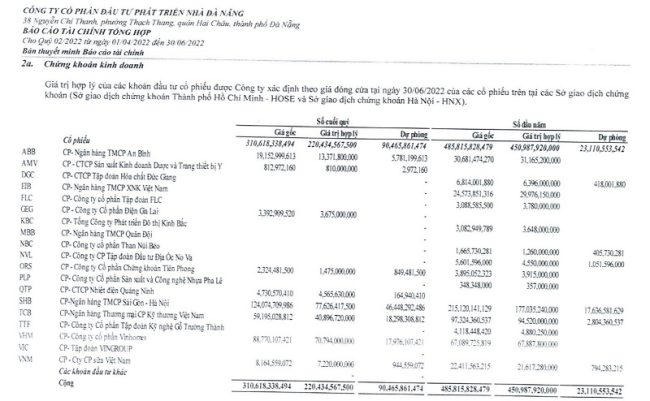 Tính tới cuối quý II, Nhà Đà Nẵng đang ghi nhận giá trị đầu tư chứng khoán là 310,6 tỷ đồng, dự phòng giảm giá 90,5 tỷ đồng và giá trị tài sản hợp lý còn 220,4 tỷ đồng. Trong đó, đáng chú ý đầu tư 124,1 tỷ đồng vào cổ phiếu SHB và trích lập dự phòng 46,4 tỷ đồng; đầu tư 59,2 tỷ đồng vào cổ phiếu TCB và trích lập dự phòng 18,3 tỷ đồng; đầu tư 88,8 tỷ đồng vào cổ phiếu VHM và trích lập dự phòng 17,98 tỷ đồng…