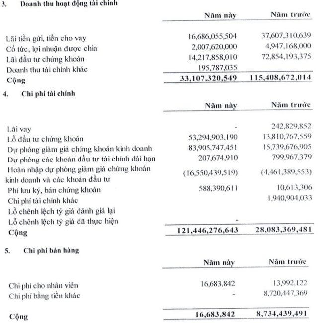 Doanh thu tài chính giảm 81,6%, tương ứng giảm 43,58 tỷ đồng về gần 9,82 tỷ đồng; chi phí tài chính tăng 995%, tương ứng tăng thêm 117,1 tỷ đồng lên 128,87 tỷ đồng; chi phí bán hàng và quản lý doanh nghiệp giảm 79,3%, tương ứng giảm 6,22 tỷ đồng về 1,62 tỷ đồng và các hoạt động khác biến động không đáng kể.