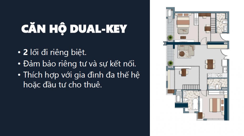 Các căn Dual Key thông thường bao gồm một căn 2 phòng ngủ và một căn studio, phân tách từ căn hộ lớn 3 phòng ngủ bằng vách ngăn. Với kết cấu như vậy, chức năng sử dụng của căn hộ có thể biến hóa vô cùng linh hoạt, tùy thuộc vào nhu cầu của chủ nhân.