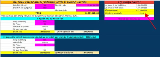Ngoài ra, nhà đầu tư còn có nguồn thu từ kinh doanh cung cấp dịch vụ khách sạn với doanh thu dự kiến khoảng 2,9 tỷ đồng. Sau khi trừ đi các chi phí, tổng lợi nhuận dự kiến có thể thu về mỗi năm khoảng 4,7 tỷ đồng. Theo bài toán này thì tỷ suất lợi nhuận/vốn đạt 15,8%.