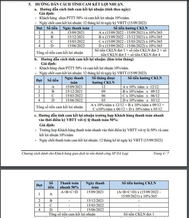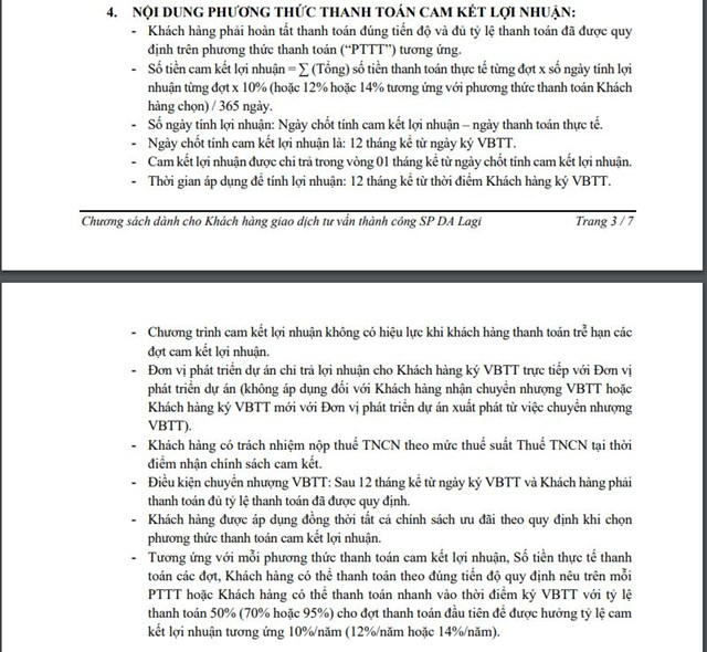 Cụ thể, chủ đầu tư cam kết lợi nhuận 10% nếu khách hàng hoàn tất 50% tổng giá trị sản phẩm trong năm đầu tiên; mức cam lết lợi nhuận 12% nếu khách hoàn tất đến 70% tổng giá trị sản phẩm và mức cam kết lợi nhuận cao nhất 14% với khách hoàn tất đến 95% giá trị sản phẩm trong năm đầu tiên…