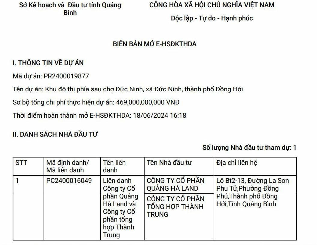 Liên doanh Công ty cổ phần Quảng Hà Land – Công ty cổ phần Tổng hợp Thành Trung là nhà đầu tư duy nhất nộp hồ sơ đăng ký thực hiện dự án khu đô thị có tổng mức đầu tư 489 tỷ đồng ở Quảng Bình.