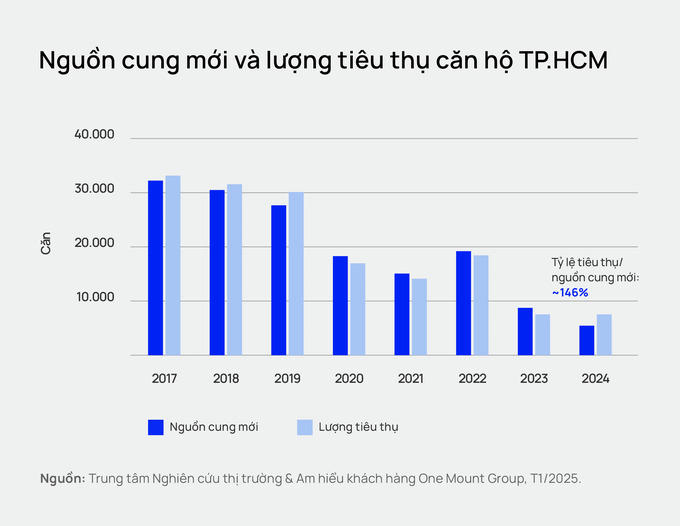 Theo báo cáo từ Trung tâm Nghiên cứu Thị trường & Am hiểu Khách hàng One Mount Group, thị trường bất động sản TP.HCM trong năm 2024 ghi nhận sự sụt giảm đáng kể về nguồn cung mới, với tổng số căn hộ mở bán chỉ đạt khoảng 5.200 căn, giảm 40% so với năm 2023.