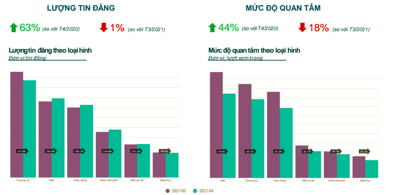 Cụ thể, mức độ quan tâm toàn thị trường trong tháng 4/2021 giảm 18% và lượng tin đăng giảm 1% so với tháng trước đó. Tuy nhiên, nếu so với tháng 4/2020, mức độ quan tâm vẫn tăng 44% và lượng tin đăng vẫn tăng 63%.