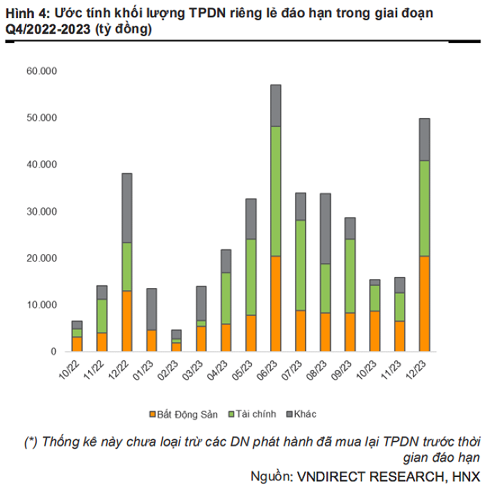 VCBS ước tính, khối lượng đáo hạn trái phiếu doanh nghiệp quý IV/2022 sẽ đạt 85.000 tỷ đồng, trong đó tập trung ở nhóm các ngân hàng (chiếm 53,4%). Đứng đầu danh sách là Ngân hàng TMCP Kỹ thương Việt Nam (Techcombank, mã chứng khoán: TCB) với 15.400 tỷ đồng, theo sau là Ngân hàng TMCP Việt Nam Thịnh Vượng với 8.000 tỷ đồng. Tiếp đó sau là Ngân hàng TMCP Bưu Điện Liên Việt với 4.000 tỷ đồng. Còn nhóm ngành bất động sản chiếm 27%.