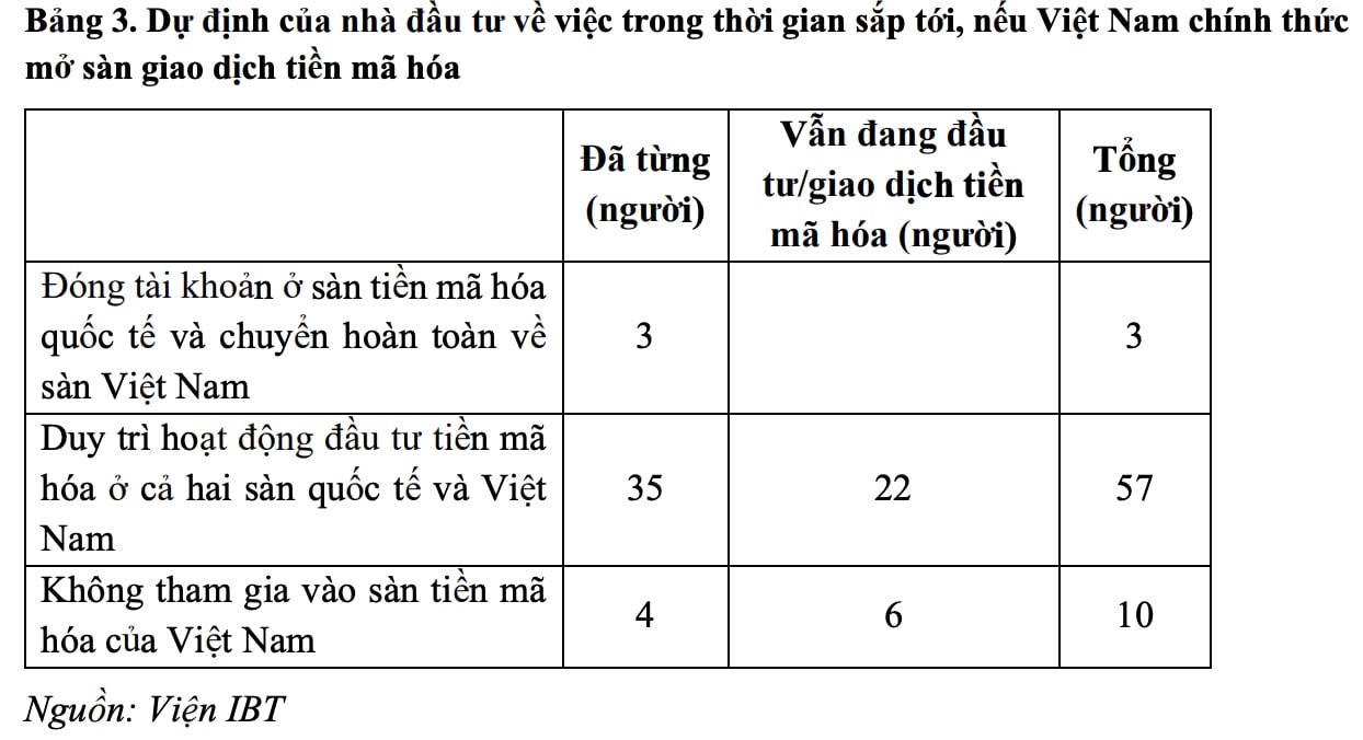 Khảo sát do Viện Nghiên cứu Phát triển Công nghệ Ngân hàng – Trường Đại học Kinh tế - Luật (Đại học Quốc gia TP. HCM) thực hiện cho thấy, phần lớn nhà đầu tư bày tỏ mong muốn duy trì hoạt động đầu tư song song trên cả sàn quốc tế lẫn nội địa nếu Việt Nam chính thức mở sàn giao dịch tiền mã hóa. Trong số người tham gia khảo sát, 50% từng đầu tư tiền mã hóa, trong khi 22 người vẫn đang tiếp tục giao dịch thường xuyên.