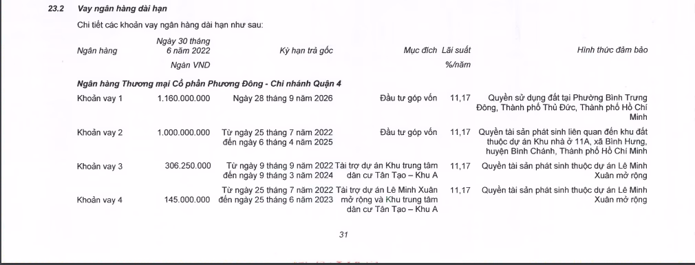 Theo đó, doanh nghiệp đã thế chấp quyền sử dụng đất tại dự án này cho khoản vay dài hạn gần 1.160 tỷ đồng tại ngân hàng TMCP Phương Đông – Chi nhánh quận 4, lãi suất 11,17%/năm, kỳ hạn trả gốc đến tháng 9/2026.