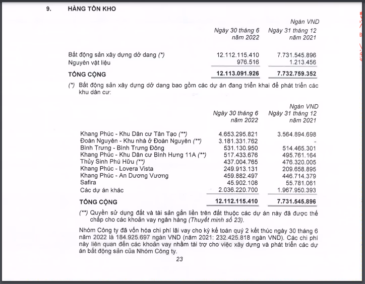 Khoản mục tồn kho của doanh nghiệp chủ yếu là bất động sản dở dang với 12.112,1 tỷ đồng. Giá trị Bất động sản dở dang chủ yếu bao gồm giá trị quyền sử dụng đất, chi phí lãi vay đã được vốn hóa, chi phí thiết kế, chi phí xây dựng… của dự án đang trong giai đoạn triển khai.