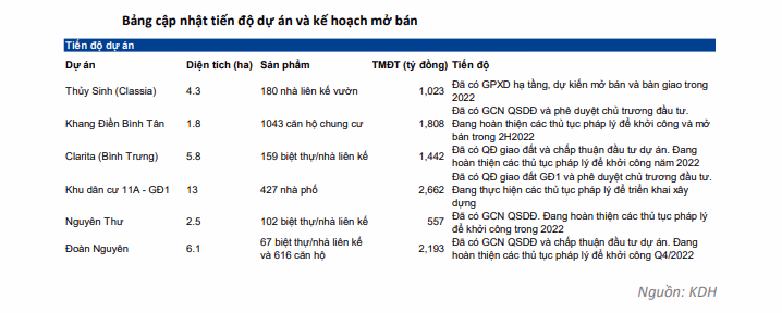 Trong một báo cáo trước đó của BSC, đơn vị này cho biết, trong nửa cuối 2022, Nhà Khang Điền sẽ triển khai 3 dự án. Cụ thể, dự án Classia tại phường Phú Hữu, TP Thủ Đức với quy mô 4,3 ha, bao gồm 180 căn nhà phố và biệt thự. Dự án dự kiến sẽ mở bán trong quý 3/2022. Với giá bán bình quân 200 triệu đồng/m (trước VAT). BSC dự phóng dự án này sẽ mang về doanh thu và lợi nhuận sau thuế lần lượt là 3.096 tỷ đồng và 1.560 tỷ đồng cho KDH.