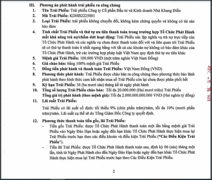 Cụ thể, HĐQT Nhà Khang Điền đã thông qua phương án chào bán tối đa 20 triệu trái phiếu, tương ứng tổng số tiền huy động tối đa 2.000 tỷ đồng.