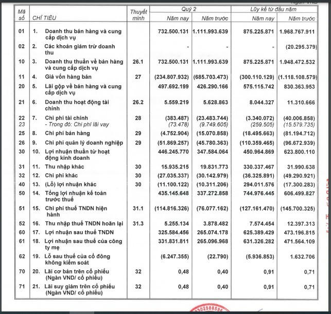 Lũy kế trong 6 tháng đầu năm, Nhà Khang Điền ghi nhận doanh thu đạt 875,2 tỷ đồng (giảm 55,1% so với cùng kỳ) và lợi nhuận sau thuế đạt 625,39 tỷ đồng, tăng 32,2% so với cùng kỳ. KDH cho biết, lãi này chủ yếu nhờ giao dịch M&A giá rẻ công ty con trong quý I.