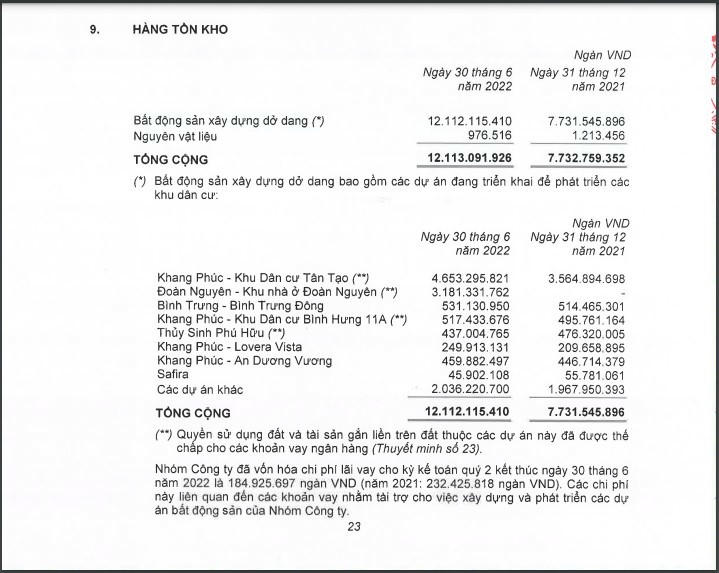 Theo Báo cáo tài chính quý II/2022 của Nhà Khang Điền cho thấy, tính đến cuối tháng 6, doanh nghiệp sở hữu lượng hàng tồn kho lên đến 12.112 tỷ đồng. Chủ yếu đến từ các dự án bất động sản đang xây dựng dở dang.