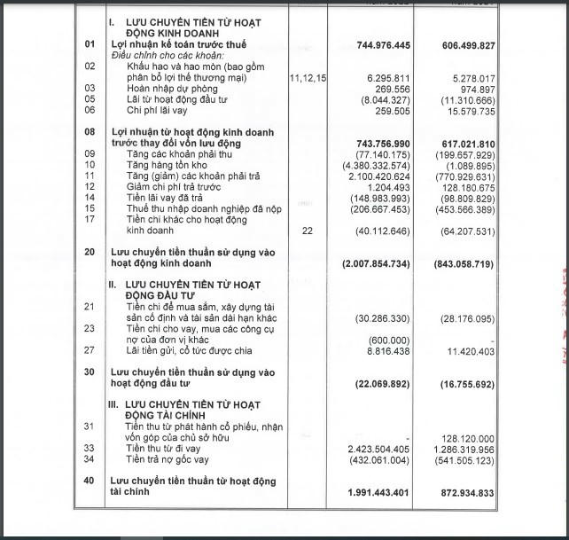 Ngoài ra, dòng tiền đầu tư âm 22,1 tỷ đồng và dòng tiền tài chính dương 1.991,4 tỷ đồng, chủ yếu tăng vay nợ.