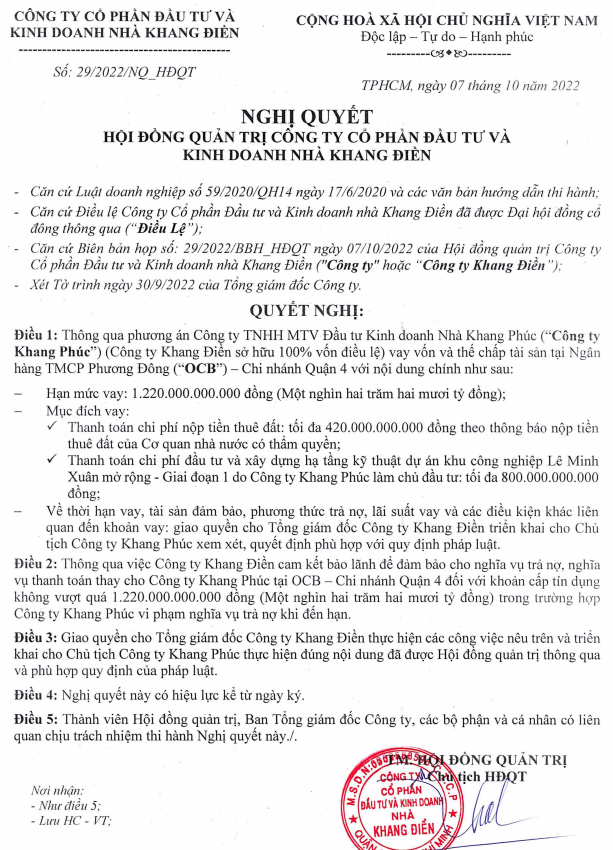 Nhà Khang Điền sẽ bảo lãnh vay vốn cho Nhà Khang Phúc để thanh toán chi phí nộp tiền thuê đất, chi phí đầu tư và xây dựng hạ tầng kỹ thuật dự án khu công nghiệp Lê Minh Xuân mở rộng giai đoạn 1.