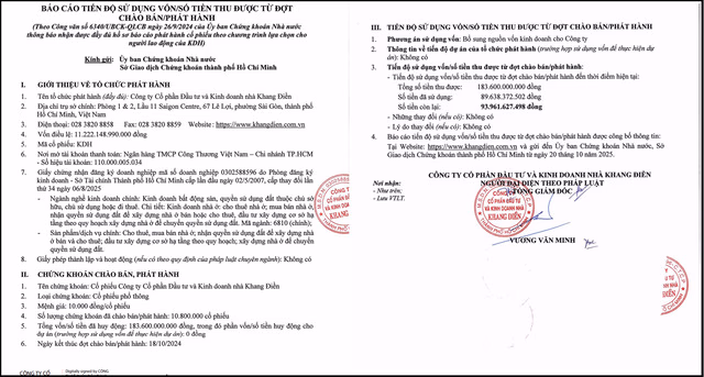 Tính đến thời điểm báo cáo ngày 20/10/2025, Nhà Khang Điềnđã sử hơn 89,6 tỷ đồng, còn lại gần 94 tỷ đồng chưa được sử dụng.