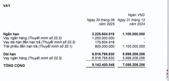 Đáng chú ý, tổng nợ phải trả của doanh nghiệp ở mức hơn11.540 tỷ, trong đó dư nợ vay chiếm hơn 9.100 tỷ tăng hơn 2.000 tỷ so với đầunăm. Trong 6 tháng, Khang Điền đã vay mới hơn 3.300 tỷ, đồng thời trả nợ gốc gần1.260 tỷ và chi hơn 375 tỷ cho lãi vay.