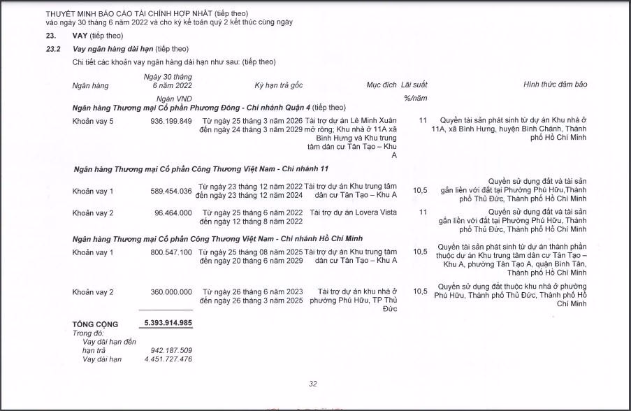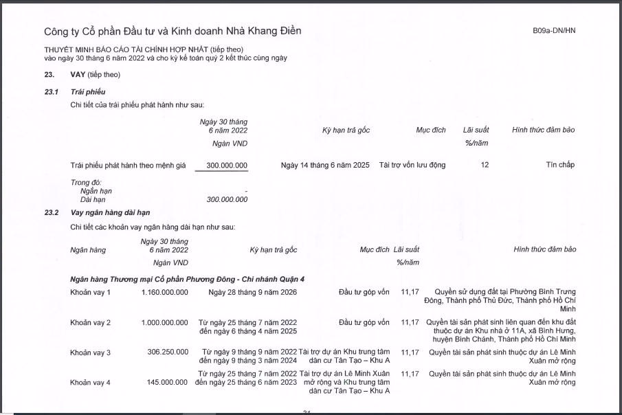 Cụ thể, tính đến quý II năm nay, Nhà Khang Điền đã vay Ngân hàng Thương mại Cổ phần Phương Đông (OCB) gần 3.548 tỷ đồng được chia làm 5 đợt. Mục đích của các đợt vay đều nhằm bổ sung vốn, tài trợ dự án Khu trung tâm dân cư Tân Tạo – Khu A và dự án Lê Minh Xuân mở rộng với lãi suất 11,17%/năm. Các khoản vay được đảm bảo gồm: quyền sử dụng đất tại phường Bình Trưng Đông, TP Thủ Đức, TP Hồ Chí Minh; tài sản phát sinh liên quan đến khu đất thuộc dự án Khu nhà ở 11A, xã Bình Dương, huyện Bình Chánh, TP Hồ Chí Minh; ngoài ra còn là quyền tài sản phát sinh thuộc dự án Lê Minh Xuân mở rộng.