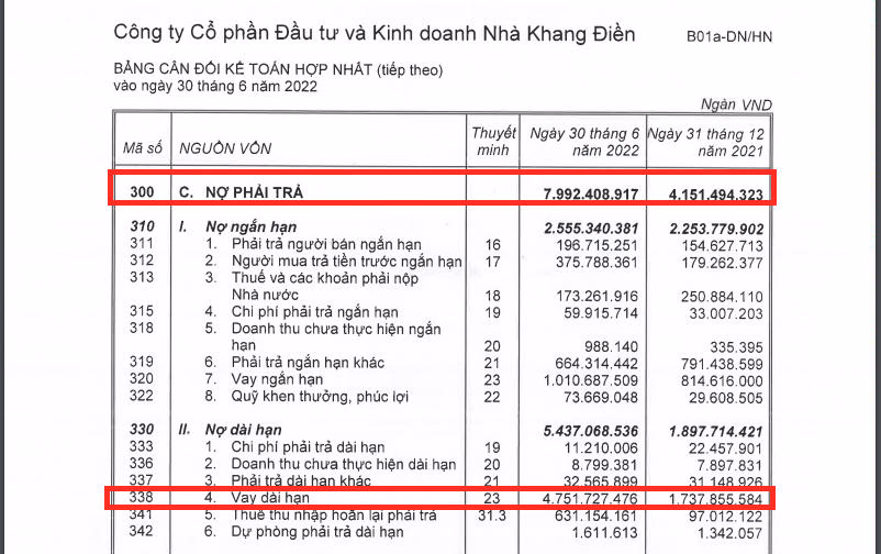 Dòng tiền kinh doanh chính âm nặng, nên Nhà Khang Điền đã liên tục gia tăng vay nợ để bù đắp sự thâm hụt của dòng tiền. Tính đến ngày 30/6/2022, nợ phải trả tại Nhà Khang Điền ghi nhận tăng mạnh lên 7.992 tỷ đồng trong khi cùng kỳ chỉ là 4.151 tỷ đồng (tức tăng 92,5% so với đầu năm).