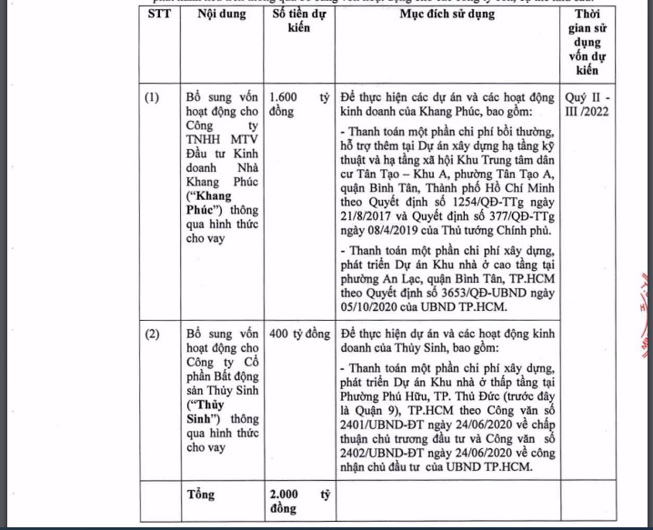 400 tỷ đồng còn lại sẽ được bổ sung vào vốn hoạt động của CTCP Bất động sản Thủy Sinh để thanh toán một phần chi phí xây dựng, phát triển dự án Khu nhà ở thấp tầng tại phường Phú Hữu, TP Thủ Đức, TP HCM.