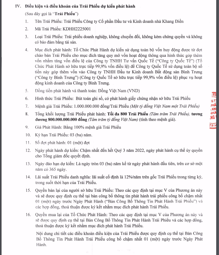 Đây là loại trái phiếu không chuyển đổi, không kèm chứng quyền và không có tài sản đảm bảo. Ngày phát hành dự kiến chậm nhất đến hết quý III/2022 với lãi suất được cố định ở mức 12%/năm.