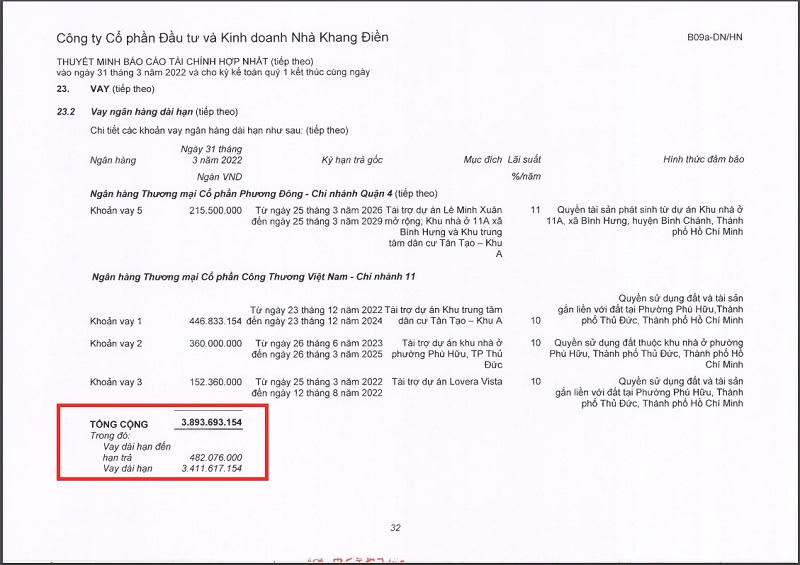Có thể thấy, khoản vay lớn nhất là của Ngân hàng thương mại cổ phần Phương Đông (OCB) với tổng cộng 2.934,5 tỷ đồng được chia làm 5 đợt. Lãi suất của các đợt đều là 11,17 %/năm. Các khoản vay đều được đảm bảo bằng quyền sử dụng đất của dự án khu nhà ở tại Phường Bình Trưng Đông, TP Thủ Đức, TP Hồ Chí Minh (đợt vay 1), quyền tài sản phát sinh liên quan khu đất thuộc dự án Khu nhà ở 11A, xã Bình Hưng, huyện Bình Chánh, TP Hồ Chí Minh (đợt vay 2 và 5) và quyền tài sản phát sinh thuộc dự án Lê Minh Xuân mở rộng cho khoản vay đợt 3 và 4.