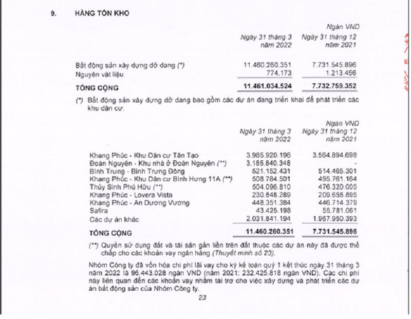 Tính đến cuối quý I/2022, Khang Điền sở hữu lượng hàng tồn kho lên đến 11.461 tỷ đồng. Chủ yếu đến từ các dự án bất động sản đang xây dựng dở dang.