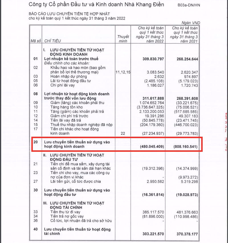 Cụ thể, tính đến ngày 31/3/2022 lưu chuyển tiền thuần vào hoạt động kinh doanh của KDH âm hơn 480 tỷ đồng (giảm gần 50% so với cùng kỳ năm trước).