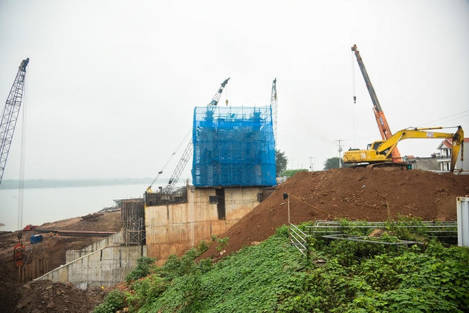 Khu vực trạm bơm lấy nước từ sông Hồng được đặt cách nhà máy khoảng một km cũng đang thi công dang dở. Để phục vụ thi công, một đoạn ngắn đê sông Hồng bị quây tôn kín.