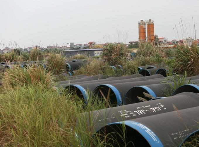 Nhiều ống dẫn nước để trong khuôn viên nhà máy bị cỏ dại xâm lấn.