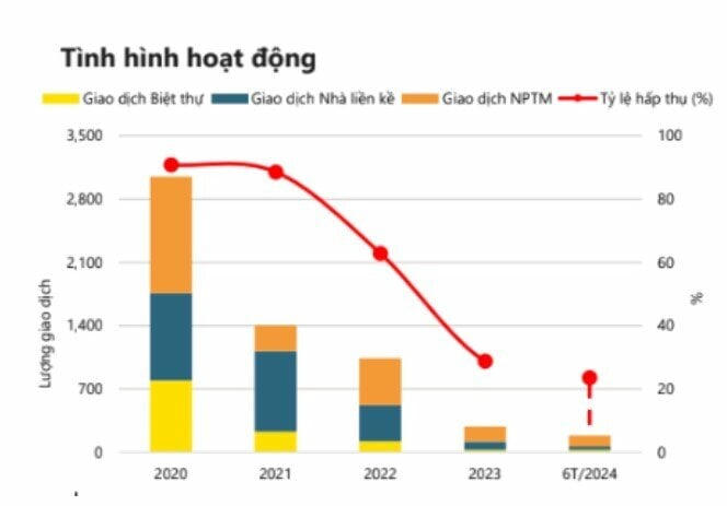 Theo Savills, tình hình hoạt động quý 2 chững lại với chỉ 72 giao dịch, giảm 36% theo quý và theo năm. Hàng sơ cấp giá cao, sự cạnh tranh từ thị trường thứ cấp và các sản phẩm giá cả phải chăng ở các tỉnh lân cận đã gây khó khăn cho thị trường TP.HCM. Những sản phẩm trên 30 tỷ chật vật với chỉ 6% được hấp thụ. Nhà liền kề có tỷ lệ hấp thụ cao nhất ở mức 31%, nhờ nhu cầu ở thực và giá cả cạnh tranh.