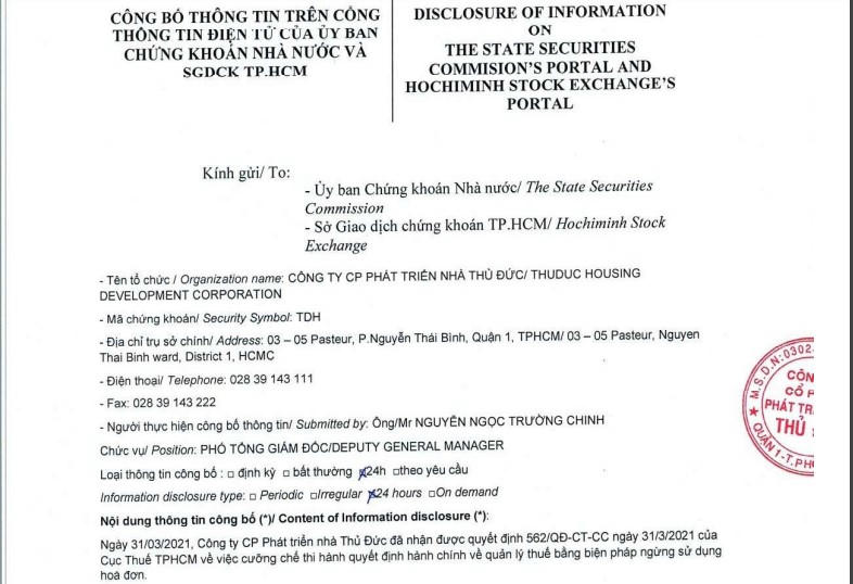Trong vòng chưa đầy 1 tháng, CTCP Phát triển nhà Thủ Đức (Thuduc House – Mã: TDH) liên tiếp nhận được những quyết định xử phạt, cưỡng chế của Cục thuế TP Hồ Chí Minh.
