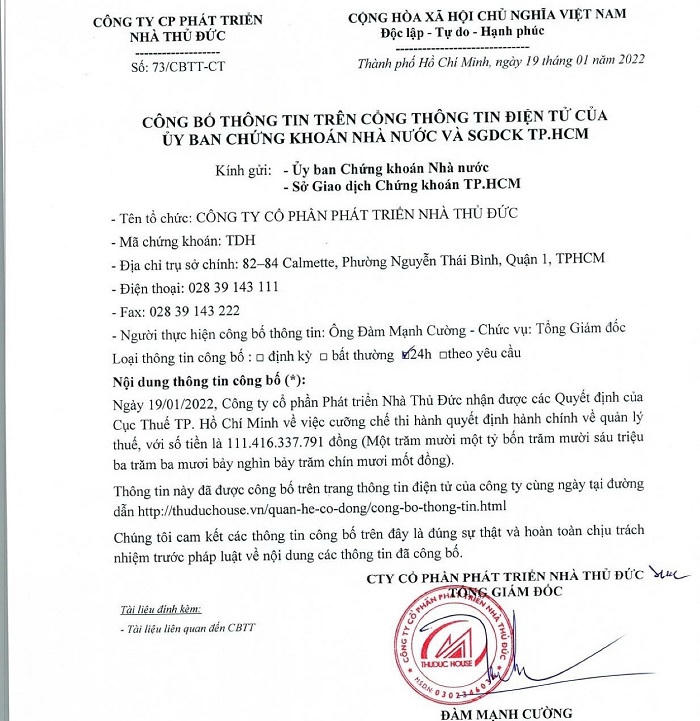 Theo thông tin được Thuduc House công bố, Công ty bị Cục thuế TP Hồ Chí Minh cưỡng chế thi hành quyết định hành chính về quản lý thuế số tiền hơn 111,4 tỷ đồng.