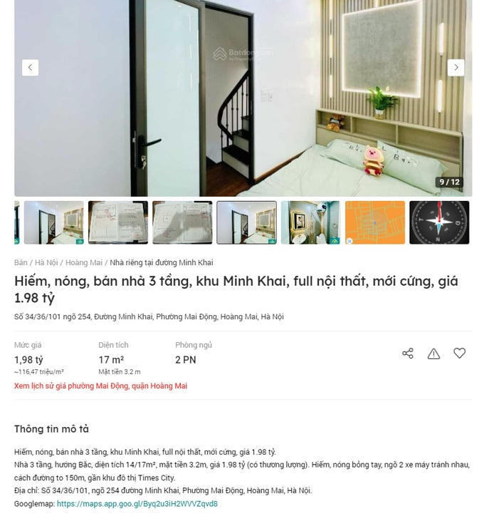 Như một căn nhà 3 tầng ở Minh Khai Hà Nội được quảng bá full nội thất, mới cứng, rao bán với giá 1,98 tỷ đồng, diện tích 17m2. Tương đương mức giá xấp xỉ 116,47 triệu đồng/m2. Mặt tiền chỉ 3,2m, nhà nằm trong hẻm 2 xe máy tránh nhau, cách đường to 150m và gần KĐT Time City.
