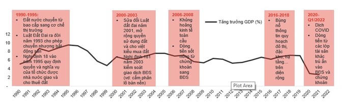 Thị trường bất động sản Việt Nam trải qua 5 đợt sốt đất trong 30 năm qua. Hai đợt sốt đất 1990-1995 và 2000-2003 liên quan nhiều đến các chính sách vĩ mô như Luật đất đai 1993; Nghị định 18 năm 1995; Sửa đổi Luật đất đai năm 2001; Nghị định 181 năm 2003... Trong khi đó, các đợt sốt đất trong vòng 5 năm trở lại đây (2016-2018; 2020-2022) đều có chung ít nhất 1 trong 3 yếu tố là Quy hoạch, vốn đầu tư và chính sách.