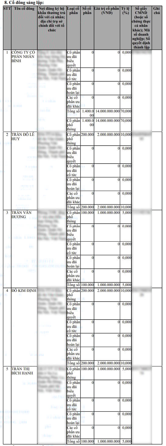 Thời điểm thành lập, Nhân Bình Invest đăng ký vốn điều lệ là 20 tỷ đồng. Cổ đông sáng lập gồm: Công ty cổ phần Nhân Bình góp 14 tỷ đồng, sở hữu 70% cổ phần; Trần Đỗ Lê Huy và Đỗ Kim Định mỗi người góp 2 tỷ đồng, sở hữu 10% cổ phần/người; Trần Văn Đương và Trần Thị Bích Hạnh mỗi người góp 1 tỷ đồng, sở hữu 5% cổ phần/người.