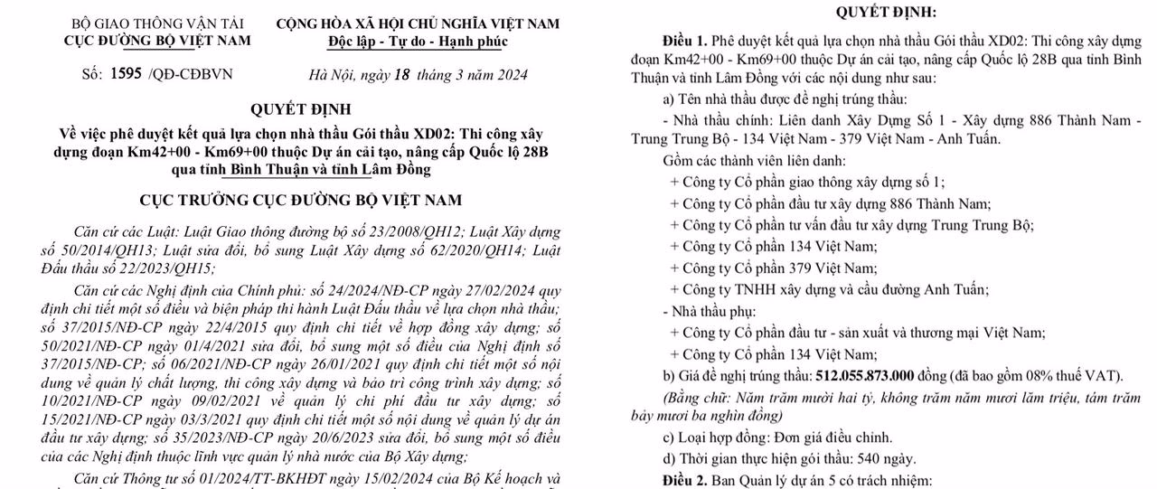 Theo đó, nhà thầu trúng thầu là Liên danh CTCP giao thông Xây Dựng Số 1 – Công ty 886-Thành Nam – CTCP Tư vấn đầu tư xây dựng Trung Trung Bộ - CTCP 134 Việt Nam – CTCP 379 Việt Nam – Công ty TNHH Xây dựng và cầu đường Anh Tuấn. Giá trúng thầu hơn 512,05 tỷ đồng; giá dự toán gói thầu hơn 514,59 tỷ đồng.