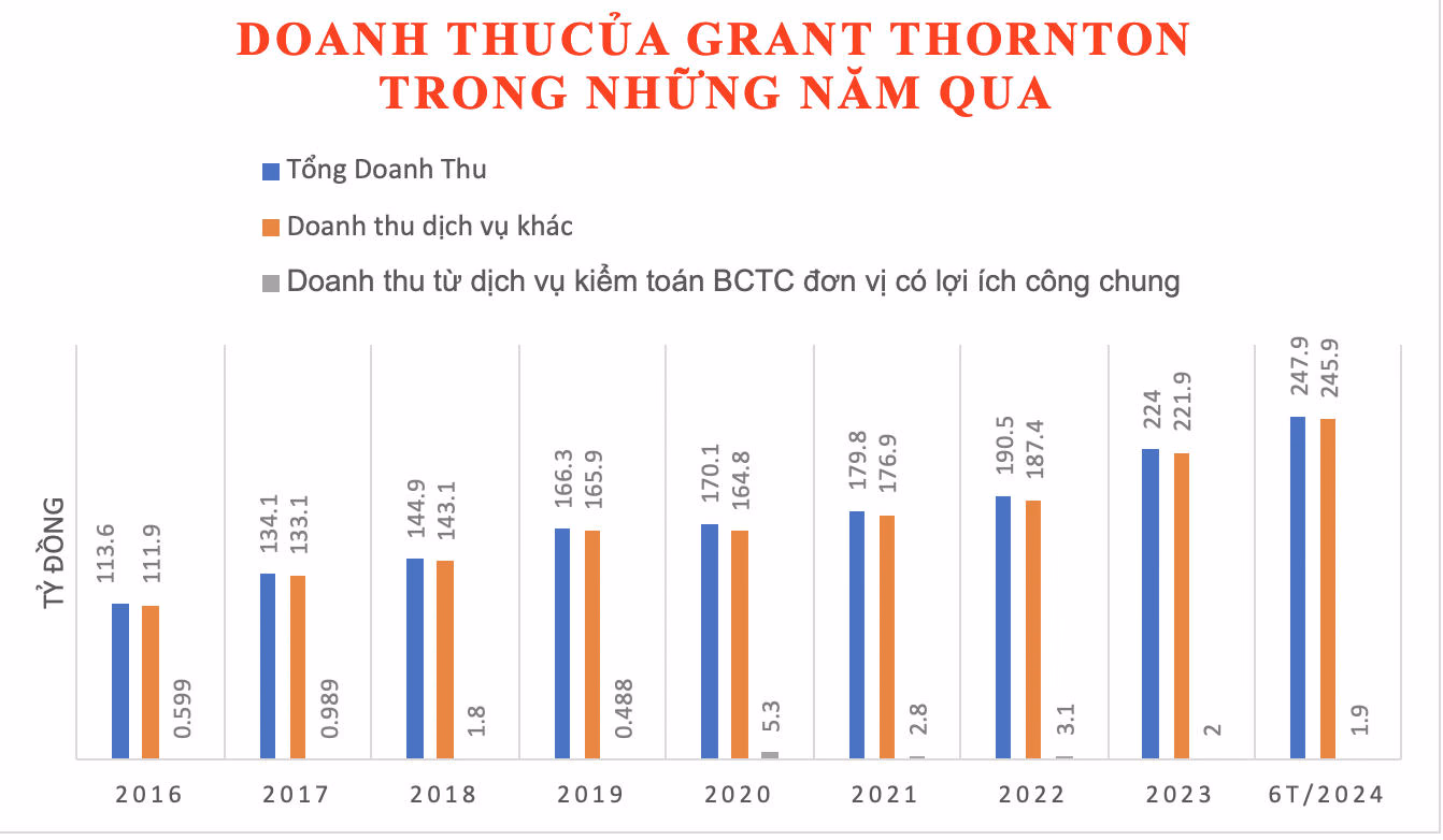 Trong nửa đầu năm 2024, Grant Thornton gi nhận tổng doanh thu đạt 247,9 tỷ đồng, đây là mức doanh thu cao nhất kể từ năm 2016 đến nay.