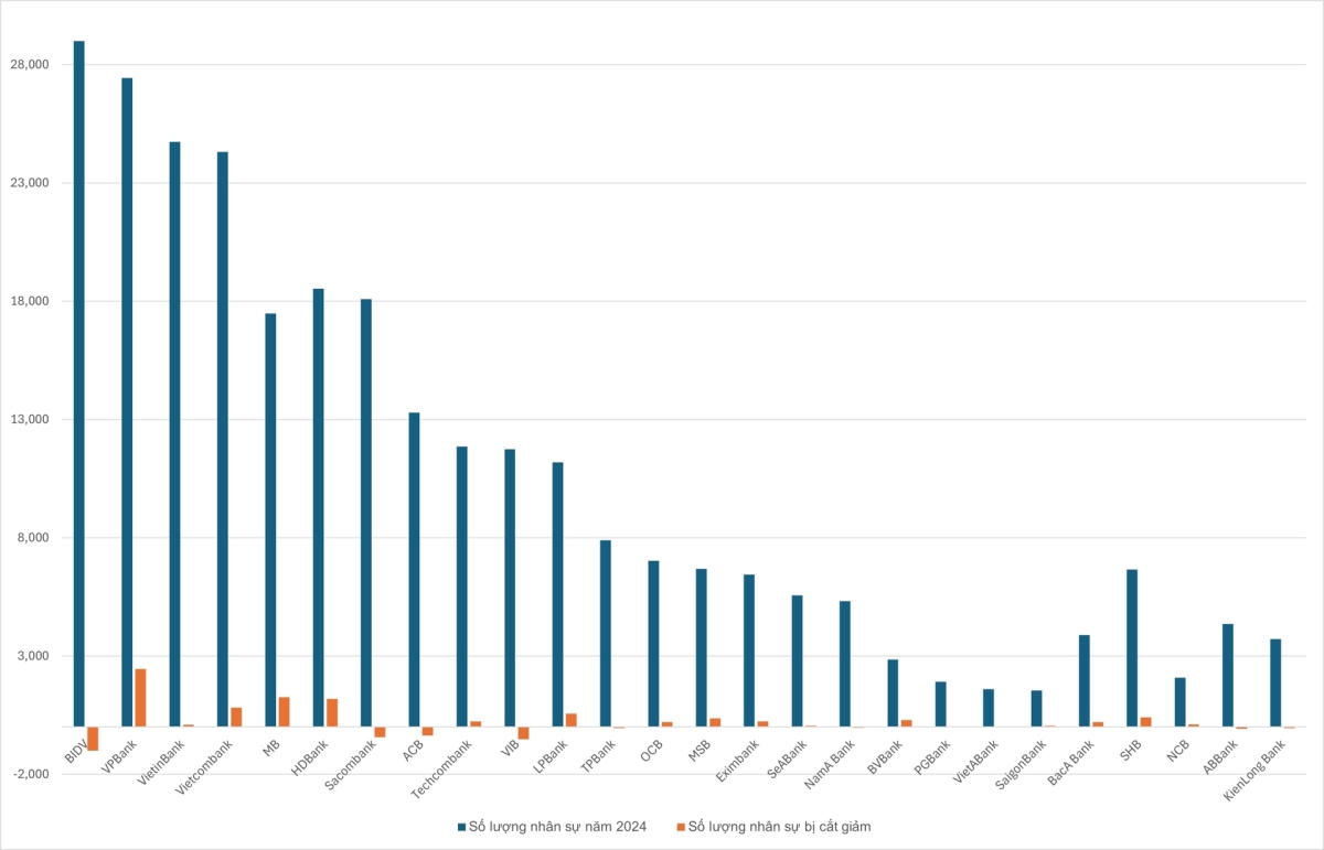Số lượng nhân sự của nhiều ngân hàng như BIDV, Sacombank, VIB,... giảm mạnh trong năm 2024. Xu hướng cắt giảm nhân sự trong ngành ngân hàng cũng được dự báo sẽ tiếp diễn trong năm nay.