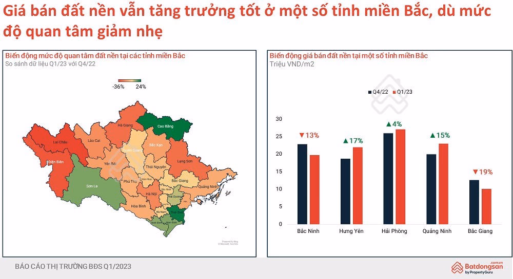 Theo số liệu phân tích từ batdongsan.com.vn, chính sách cho thị trường bất động sản đã mang lại tín hiệu tích cực cho thị trường. Khi phân tích trên cơ cấu mức độ quan tâm các loại hình BĐS trên toàn quốc, loại hình căn hộ chung cư phục vụ nhu cầu ở thực và đầu tư dài hạn đang dẫn đầu với nhu cầu tìm mua chiếm 27%, tăng 4% so với năm 2022. Nhà mặt phố và nhà riêng là loại hình BĐS có giá trị khai thác thương mại cũng có được nhiều quan tâm với lượt tìm kiếm lần lượt chiếm 20% và 9%, tăng 1% so với cùng kỳ. Còn với đất nền, đất nền dự án, nếu năm 2022 tổng số lượt tìm kiếm chiếm 31% thì quý 1/2023 đã giảm xuống 7%, chỉ còn chiếm khoảng 24% trong cơ cấu các loại hình BĐS, không còn là phân khúc được quan tâm nhiều nhất.