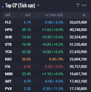 Thanh khoản ở mức rất cao với tổng khối lượng giao dịch đạt 1,1 tỷ cổ phiếu, tương ứng giá trị giao dịch là 21.280 tỷ đồng, trong đó, giao dịch thỏa thuận chiếm 18.330 tỷ đồng. FLC đứng đầu danh sách khớp lệnh toàn thị trường với 55,6 triệu cổ phiếu. Hai cổ phiếu bất động sản khác cũng nằm trong danh sách 10 mã khớp lệnh mạnh nhất là KBC và ITA với lần lượt 23,7 triệu cổ phiếu và 20,8 triệu cổ phiếu.